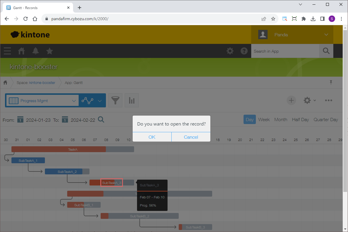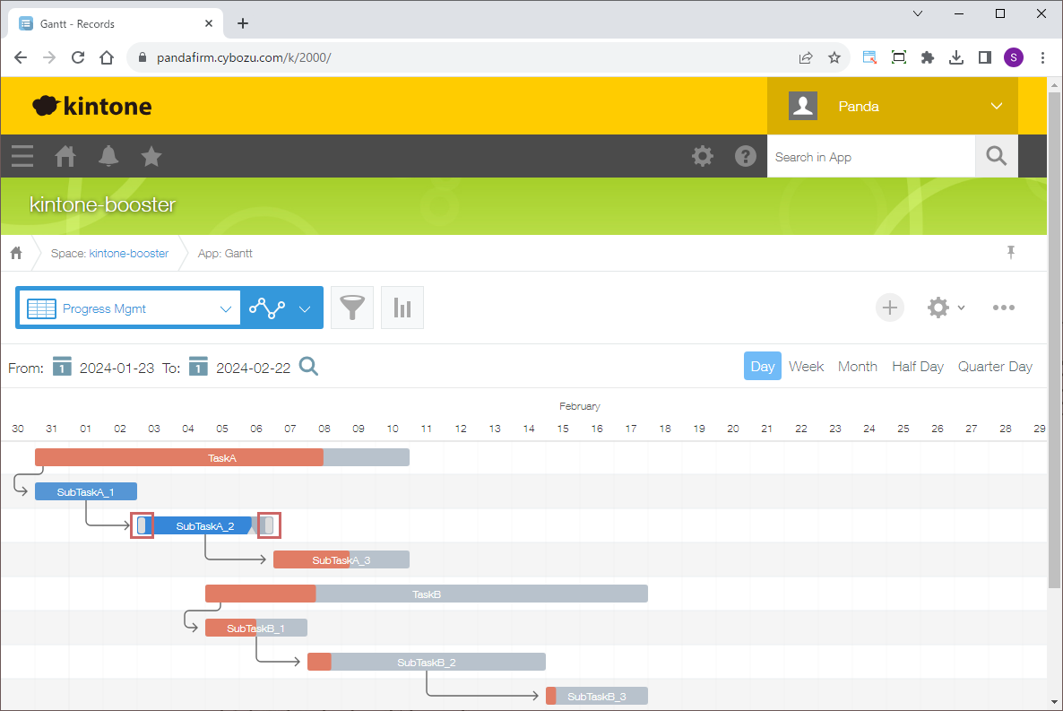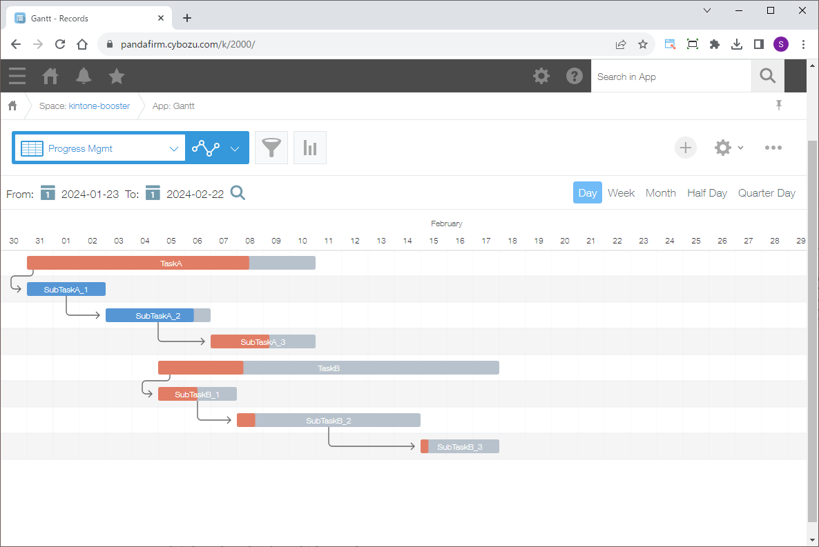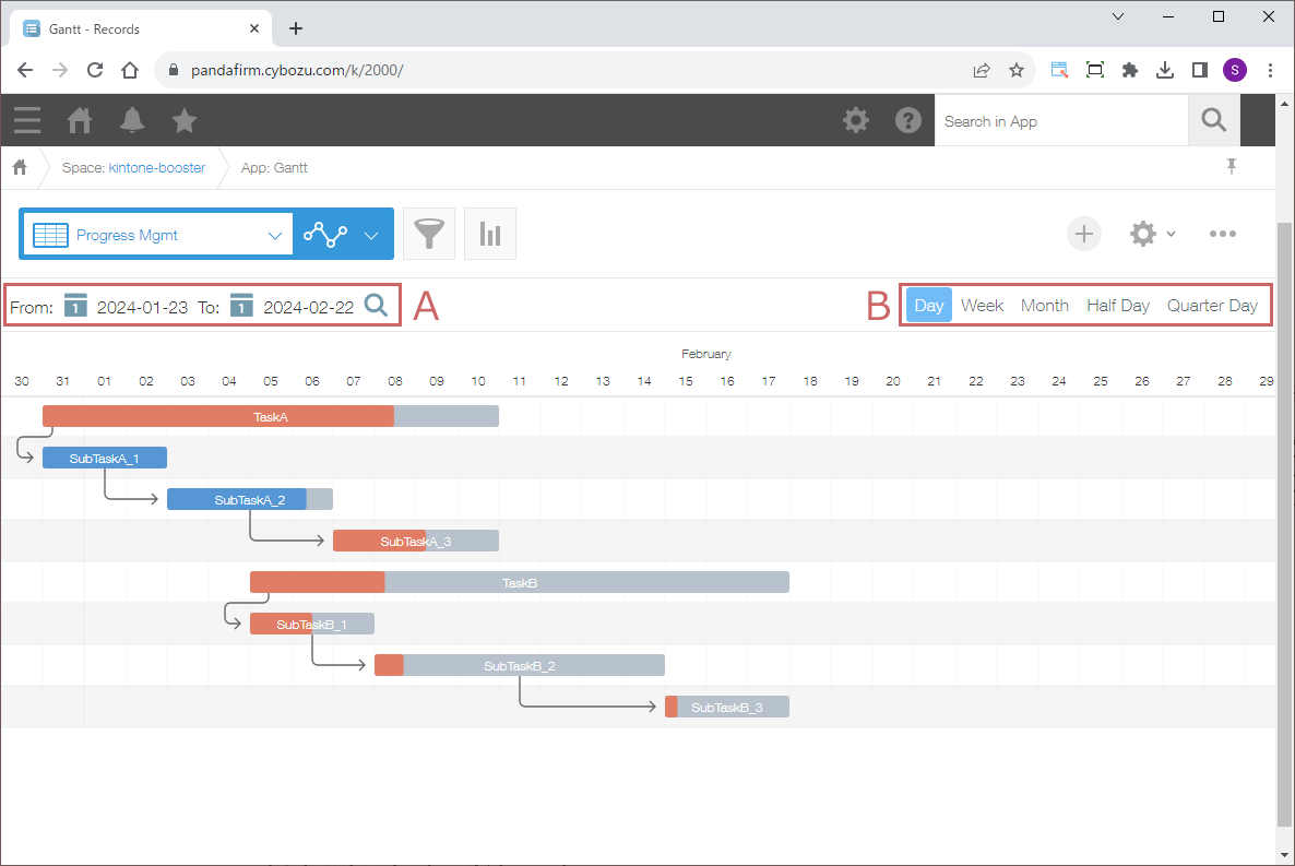 To switch the date displayed, select a date in area A and click the magnifying glass icon, and for switching the Gantt chart format displayed, please use area B.