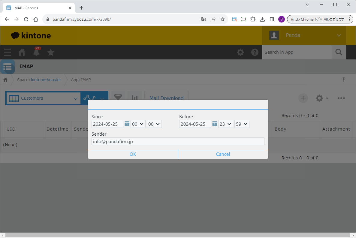 When you click the displayed button, a screen will appear for entering the target period and sender. If you want to filter the emails by sender, enter the sender's email address.
