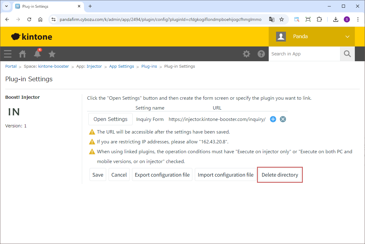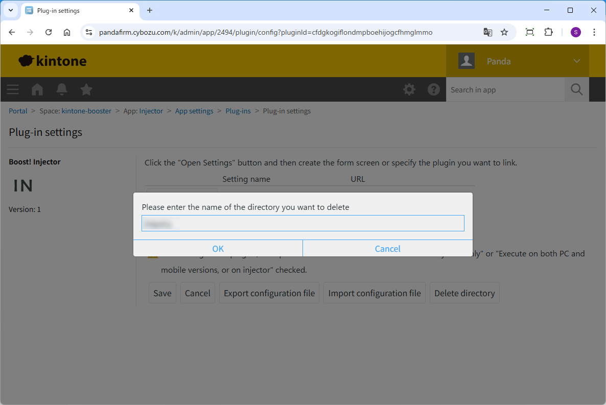 If you enter "injector" as the directory name, the URL of the Web form will be "https://injector.kintone-booster.com/injector/". You can only enter half-width numbers, lowercase letters (a-z), and symbols such as hyphens (-) and underscores (_). |