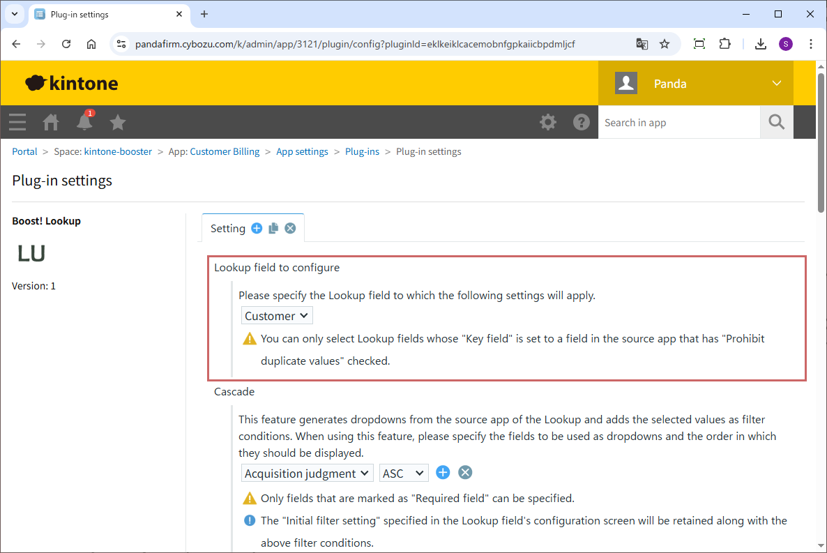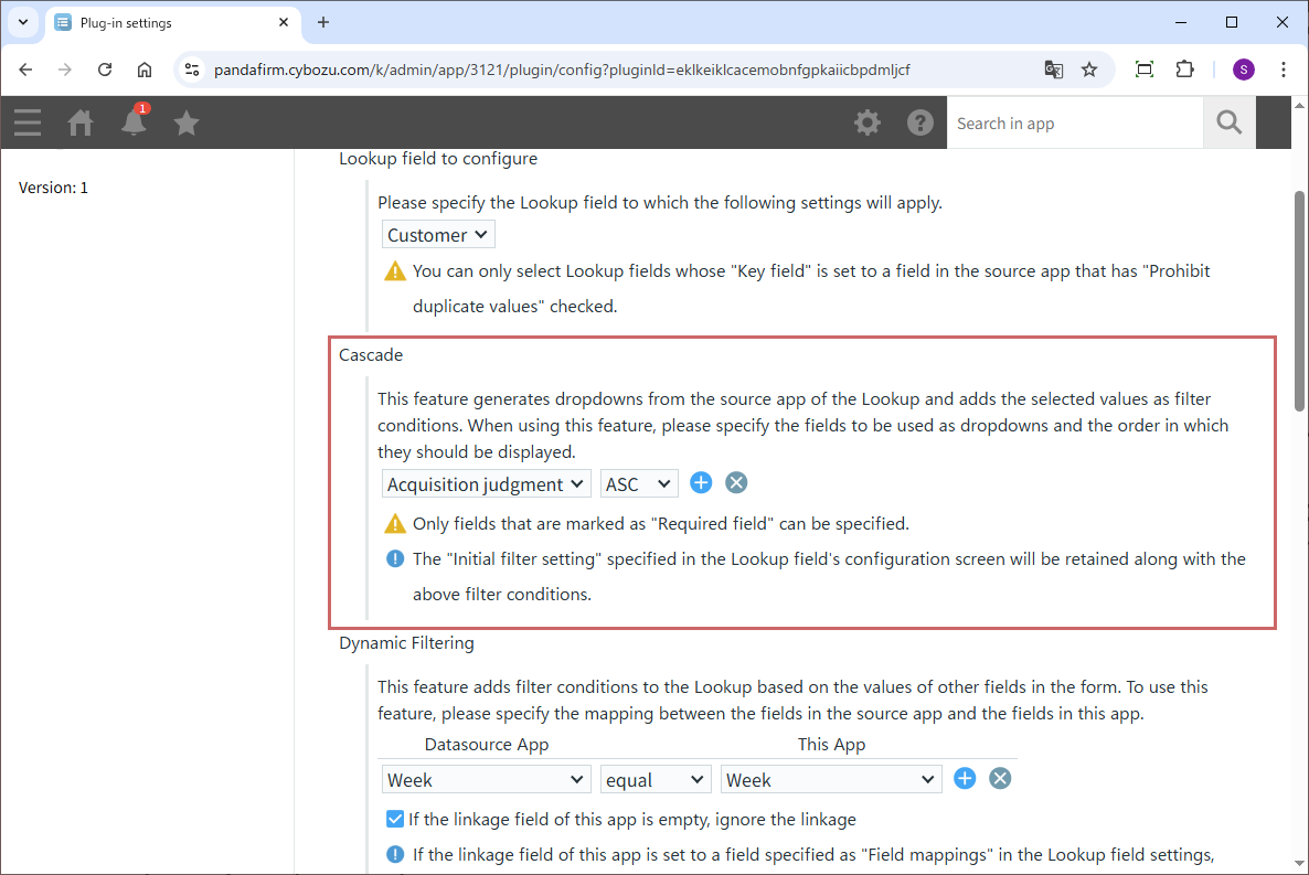If you want to generate a dropdown based on data from the source app of the lookup and use the selected value as an additional filter condition, configure it in the “Cascade” section.