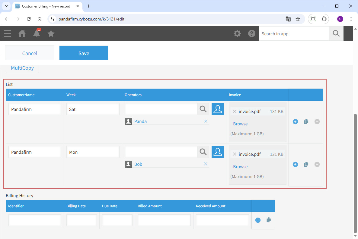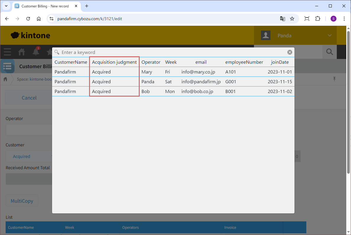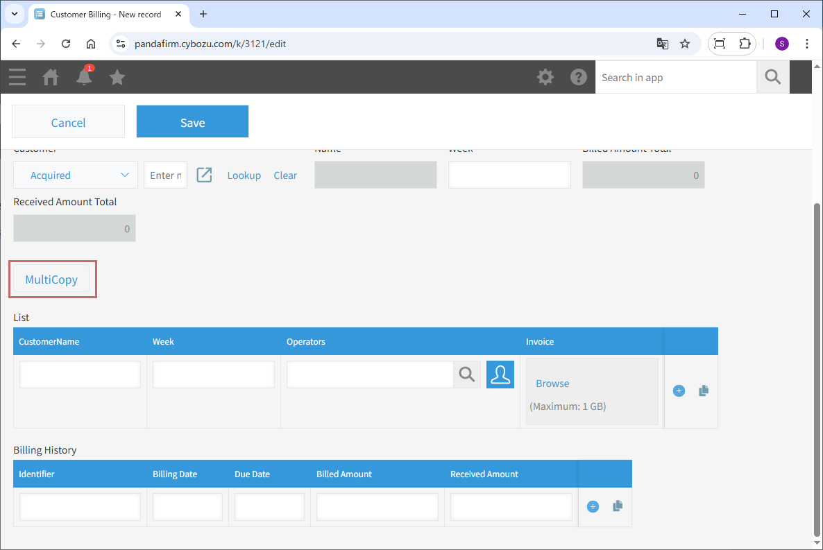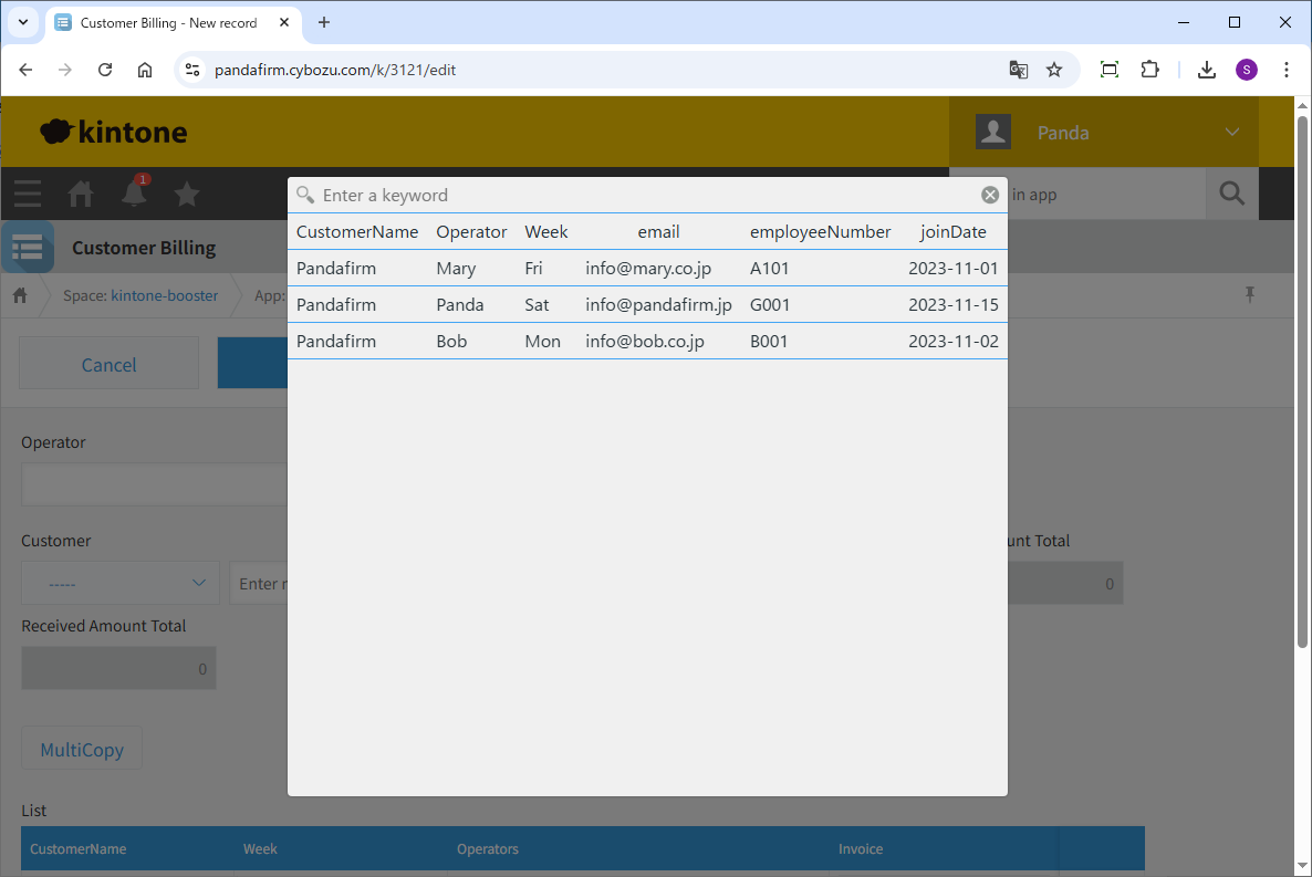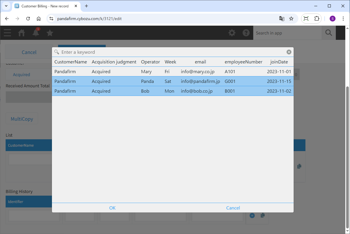Clicking the displayed button will open a screen to select records to copy. After selecting the desired records, they will be copied into the table.