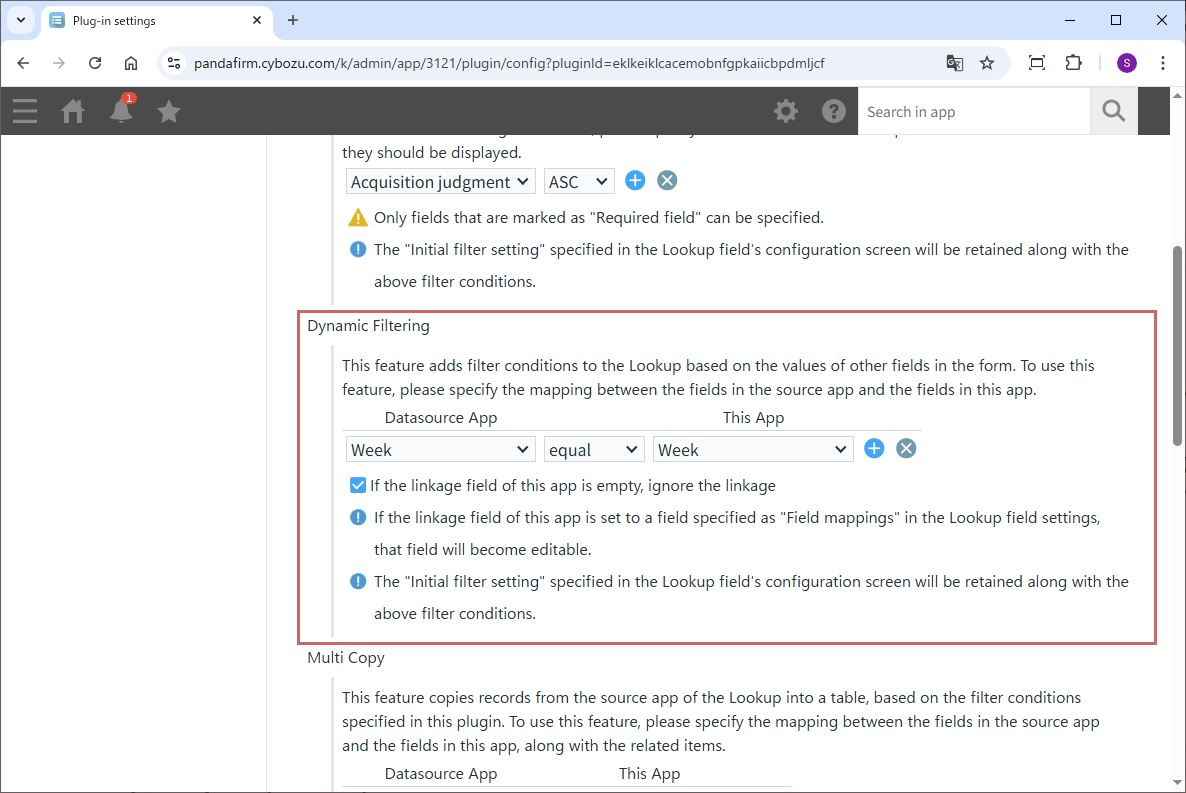 If you want to copy records that match the filter conditions specified by this plugin from the lookup source app into a table, configure it in the “Multi Copy” section.