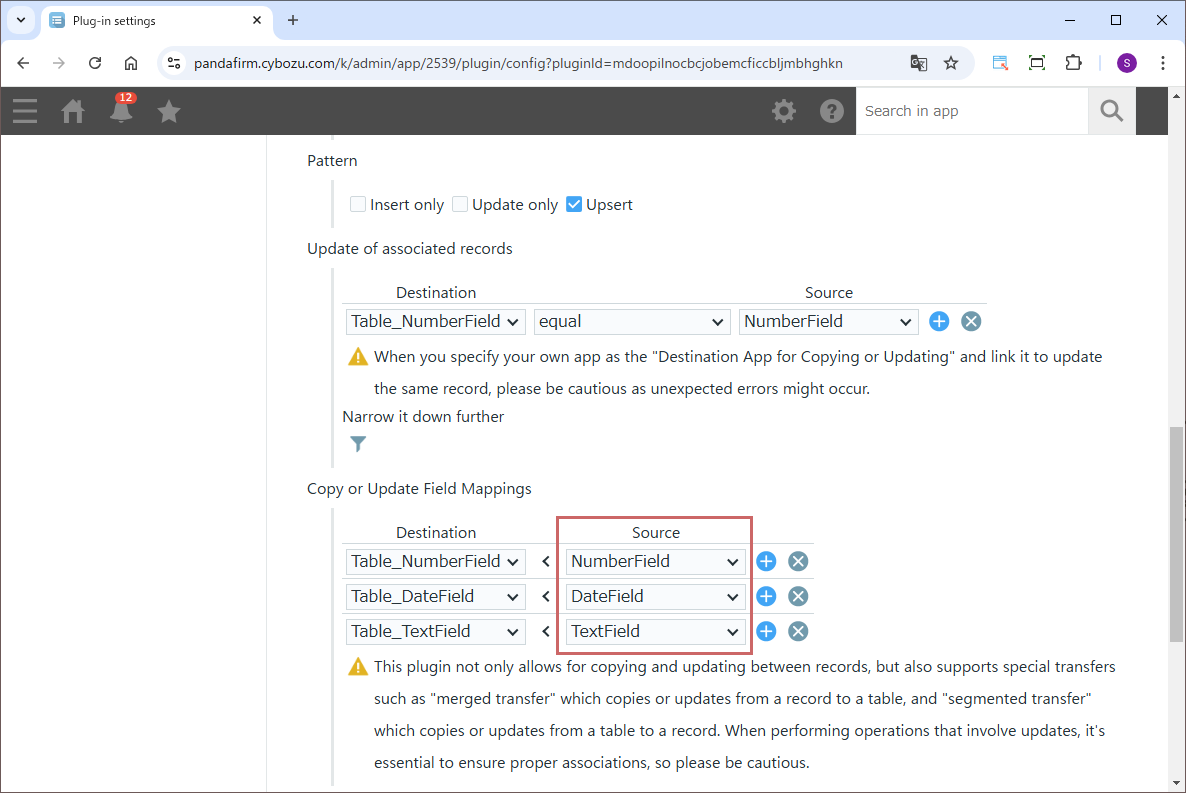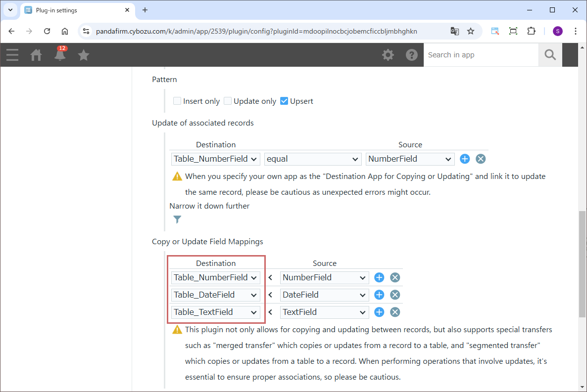 When selecting "Update only" or "Upsert" in the pattern settings, specify the "Update of associated records" field in the same manner.