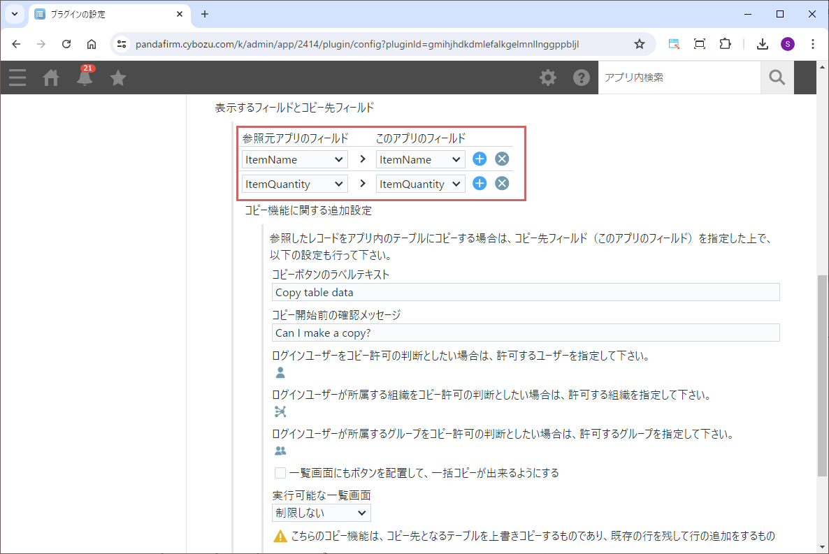 続いて「表示するフィールドとコピー先フィールド」で、コピーするフィールドを指定します。