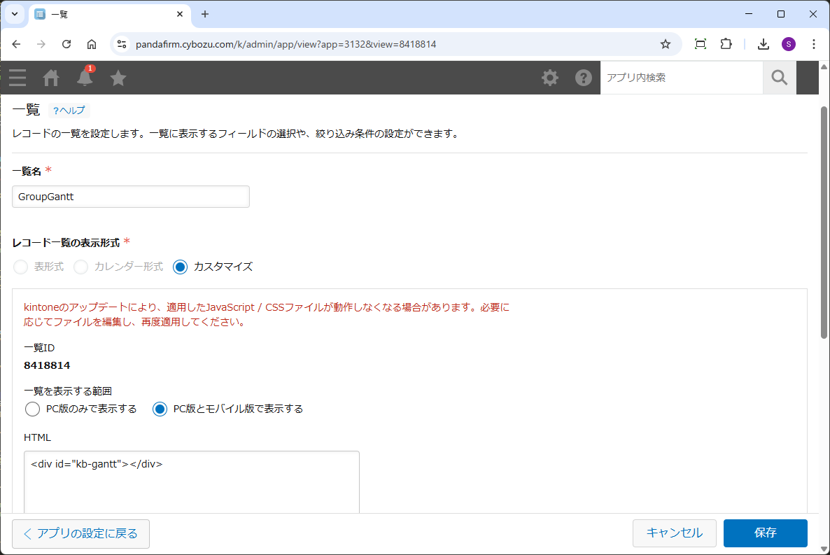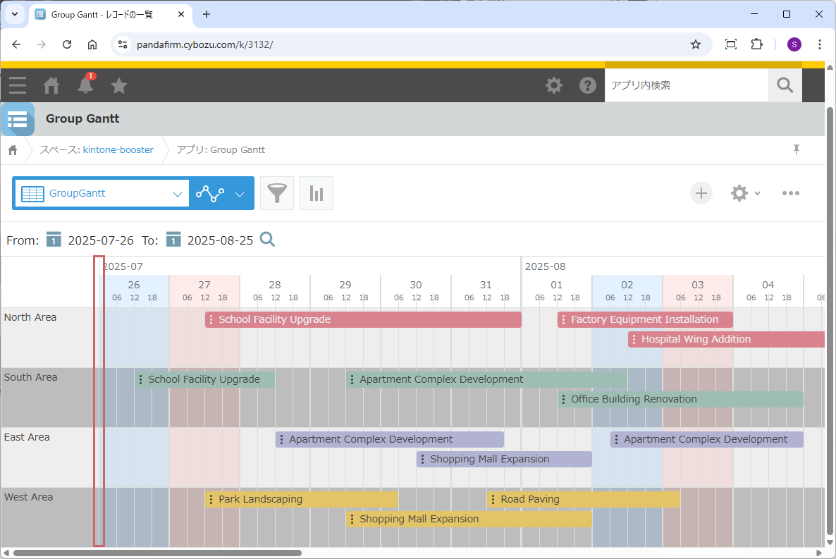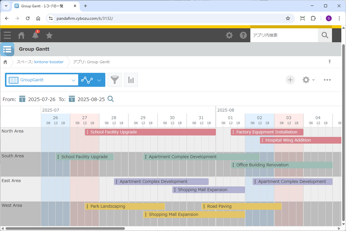 設定画面で指定したカスタマイズ形式の一覧を表示するとガントチャートが表示されます。