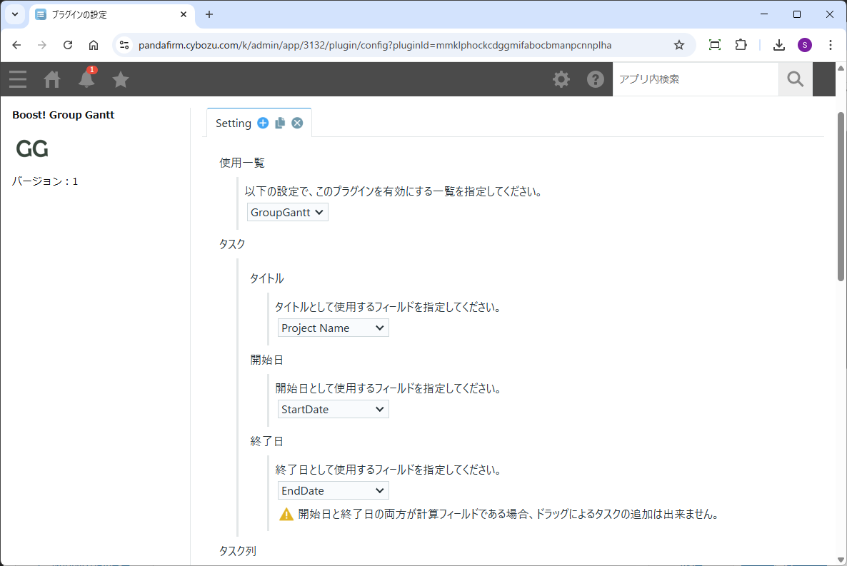 次に、プラグインの設定画面を開いて、表示したい内容に合わせた各フィールドやグループ化の条件等を指定します。