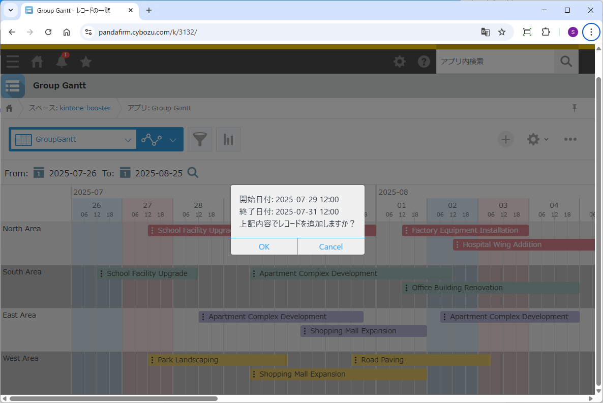 確認画面で「OK」をクリックすると、別ウィンドウで追加画面が開き、保存後に元のガントチャート画面の内容が自動的に同期されます。