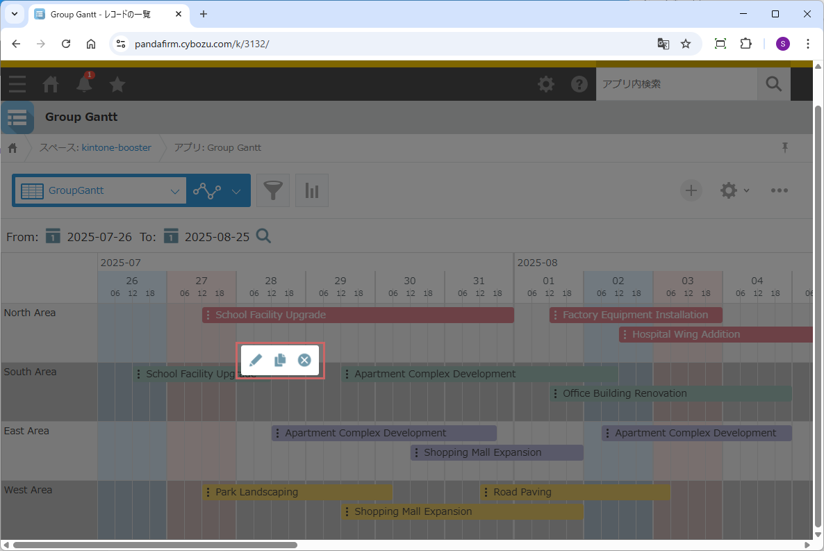 「編集」および「再利用」を選択すると、別ウィンドウで編集画面が開き、保存後は元のガントチャート画面の内容が自動的に同期されます。