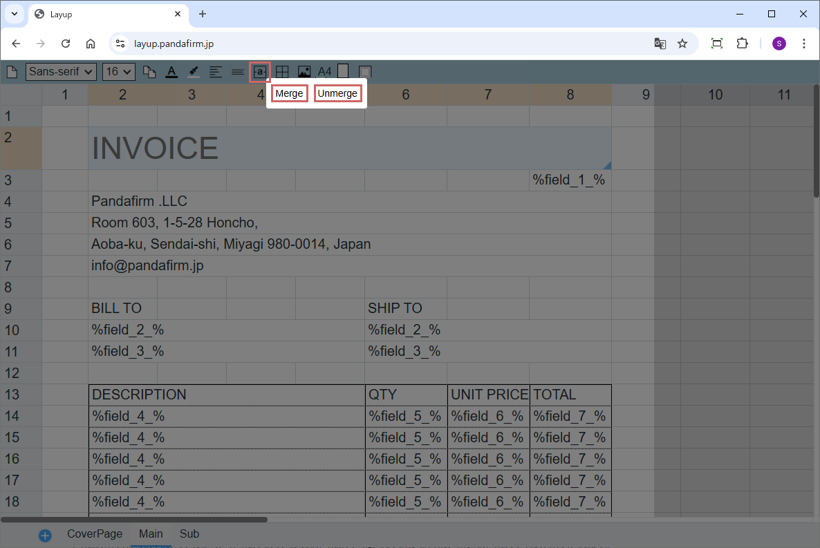 「Unmerge」ボタンをクリックすると、選択中のセルの結合を解除します。