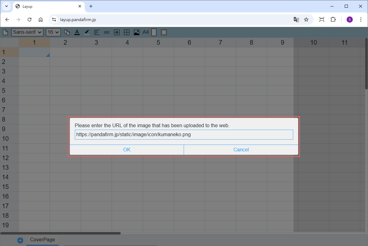 画像ボタンをクリックして表示されるプロンプトウインドウにアップロード済み画像のURLを入力します。