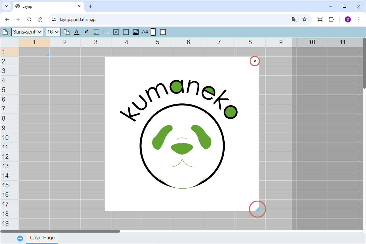 配置した画像の削除は右上の「x」ボタンをクリック、サイズの変更は右下のリサイズハンドルのドラッグで行えます。