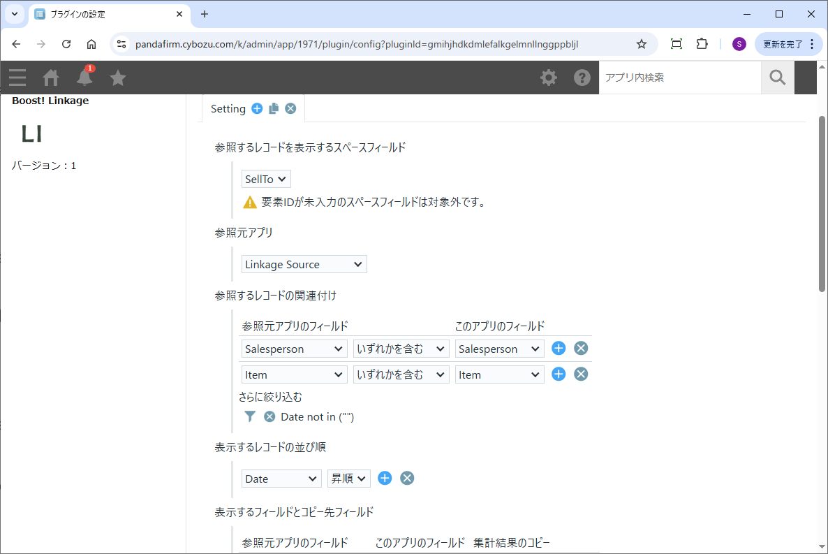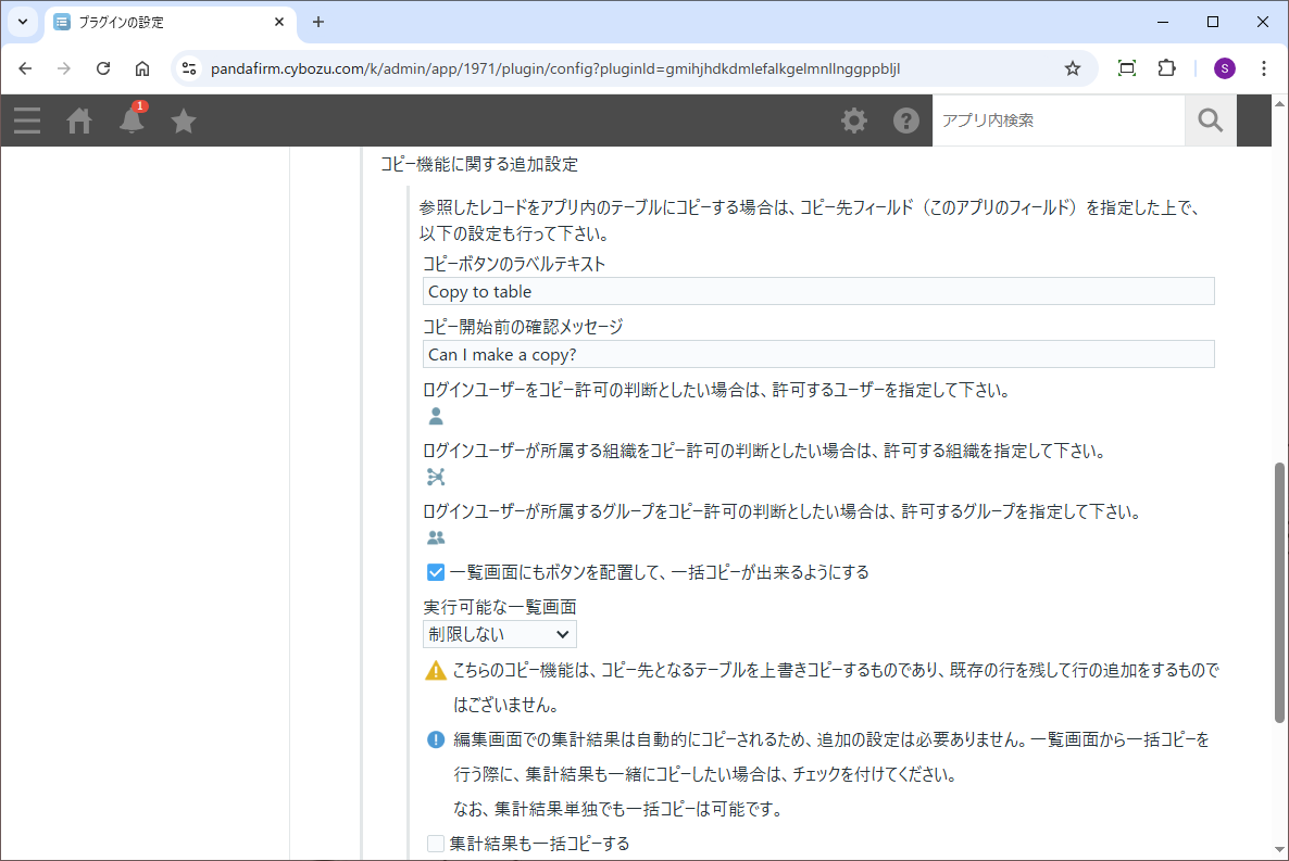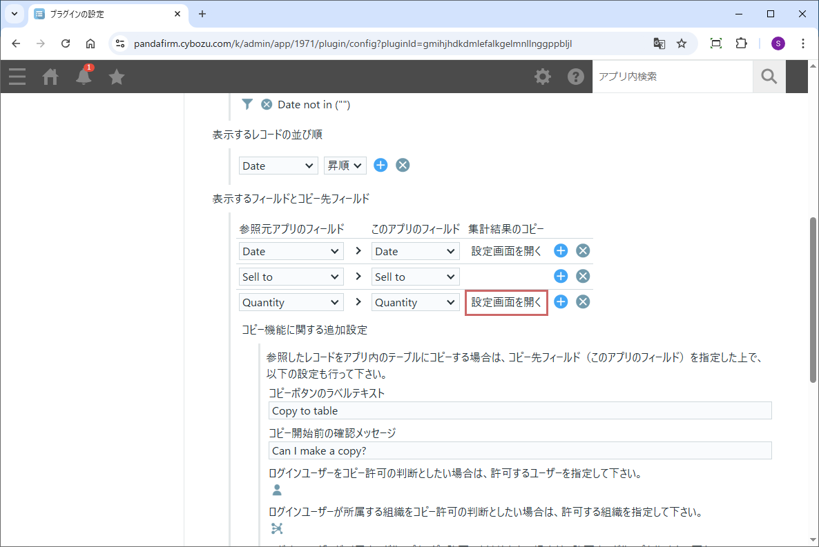 プラグインの設定画面を開いて、表示内容に合わせた各フィールドの指定やコピーに関する動作設定をします。