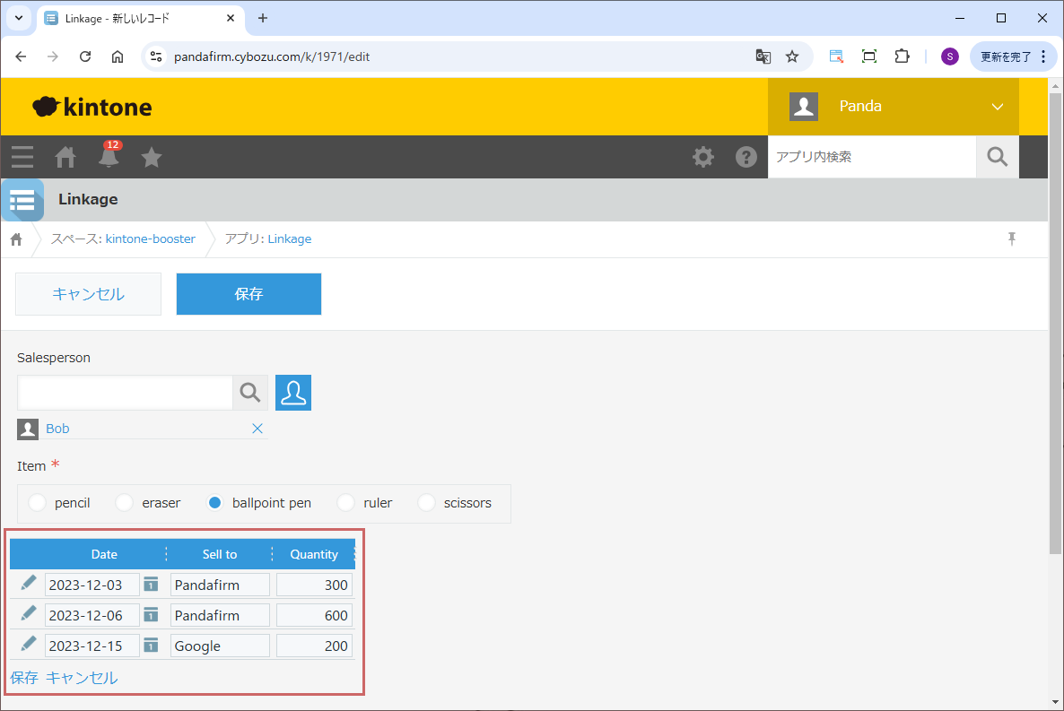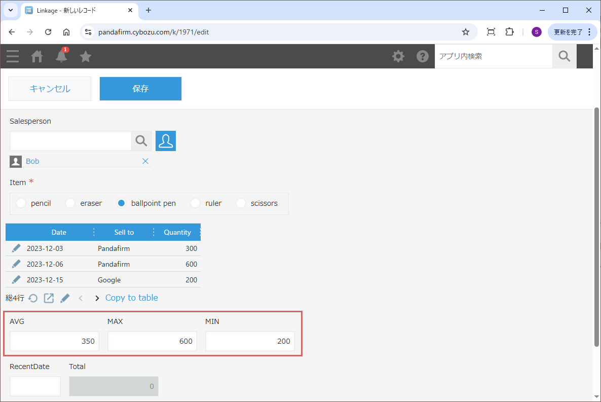 集計結果はレコード詳細画面においても表示されますが、この時点ではレコードには登録されておりません。レコードに登録したい場合は編集画面に遷移し、保存処理を行って下さい。