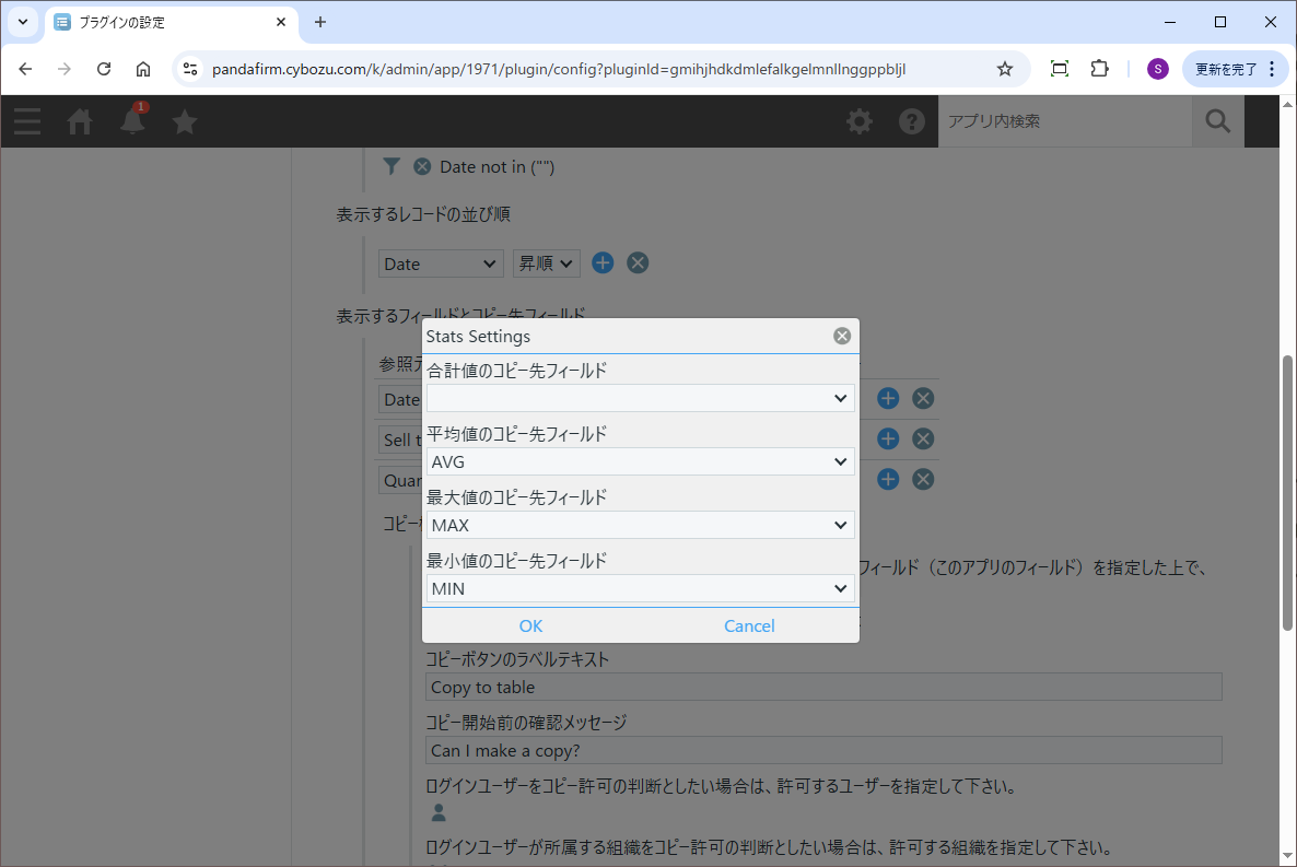 表示するフィールドの中で数値と日付系フィールドの集計結果をコピーしたい場合は、「集計結果のコピー」列のボタンから設定を行います。