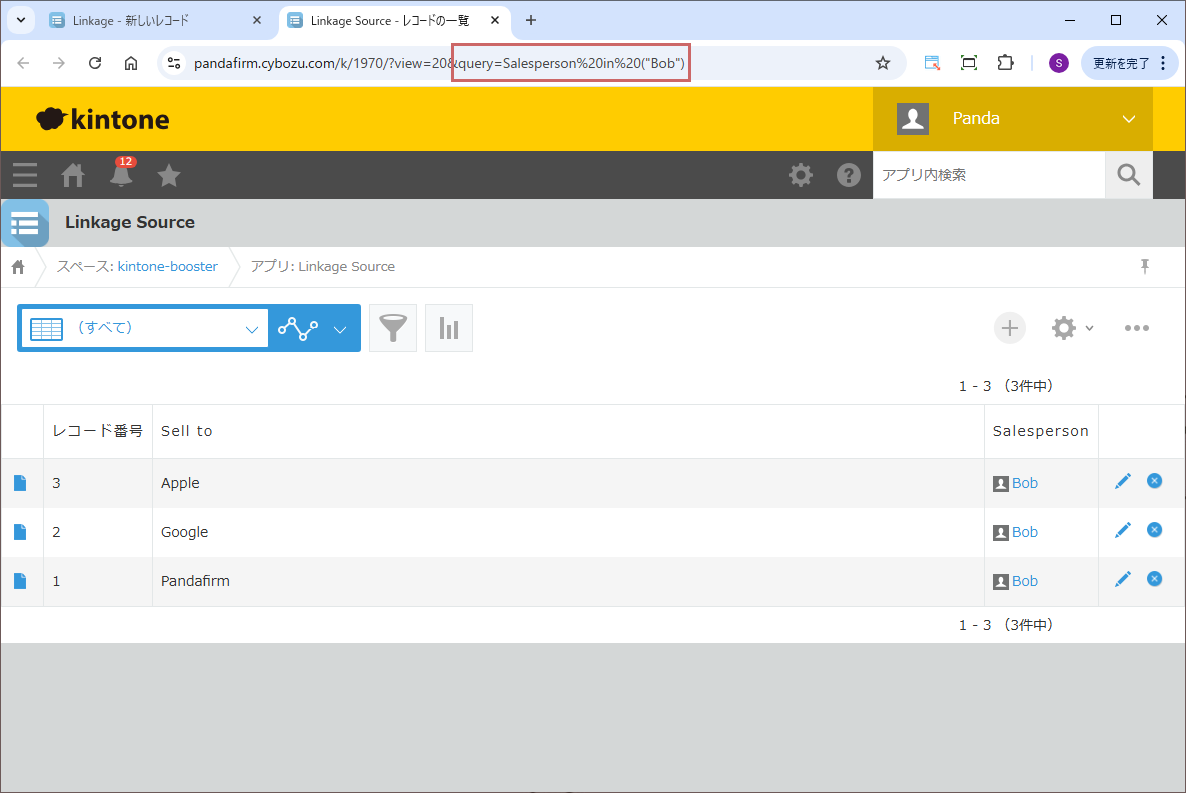 一覧の下部に表示されているアプリ表示ボタンをクリックすると、レコードの取得条件をそのまま絞り込み条件に指定した状態で参照元アプリの一覧画面を別ウインドウで開くことが出来ます。