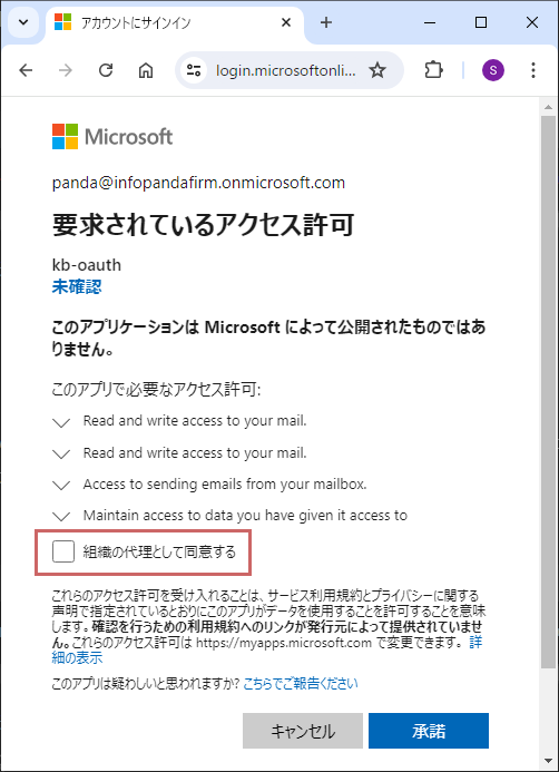 「要求されているアクセス許可」画面において、「組織の代理として同意する」にはチェックを入れないようにして下さい。。