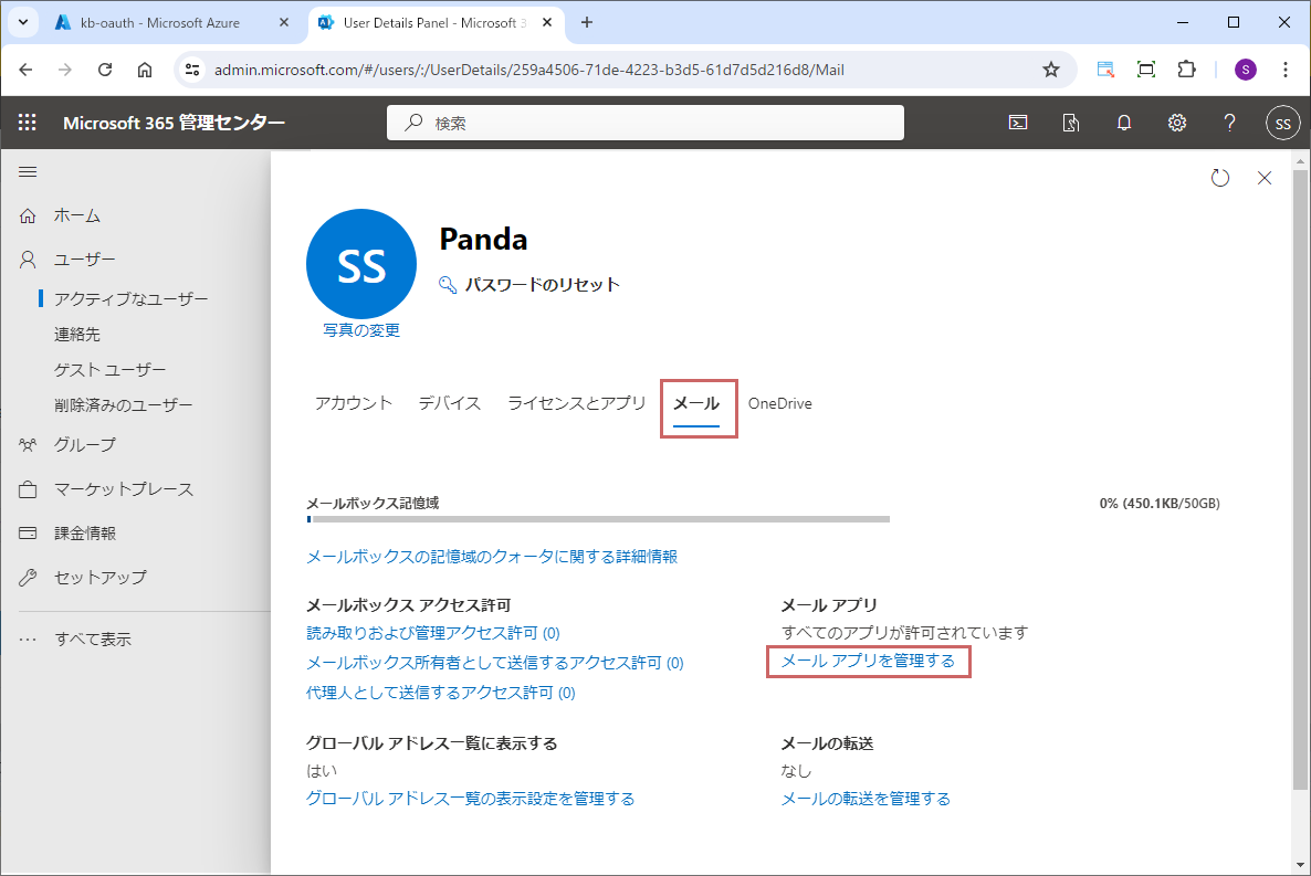 Microfost365管理センターにアクセスして、「ユーザー」 > 「アクティブなユーザー」 を選択し、対象ユーザーの詳細画面から 「メール」 > 「メールアプリを管理する」を選択します。