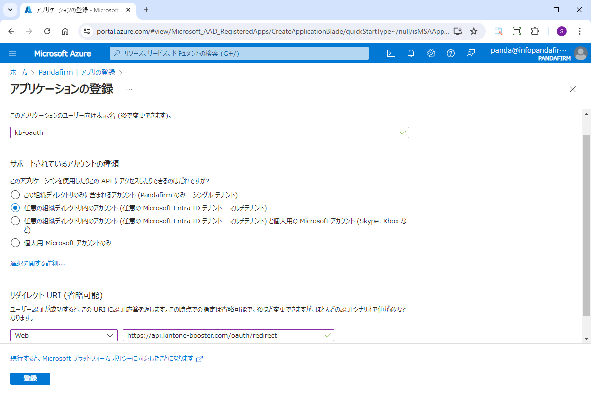 リダイレクトURIには以下の内容を入力して、サポートされているアカウントの種類では「任意の組織ディレクトリ内のアカウント」を選択します。