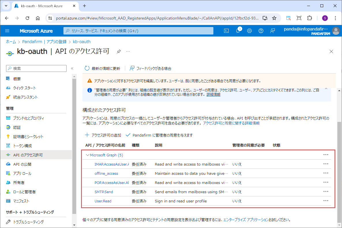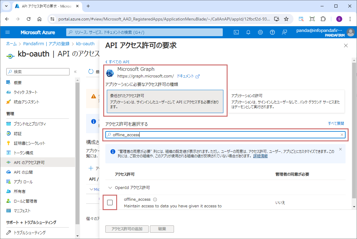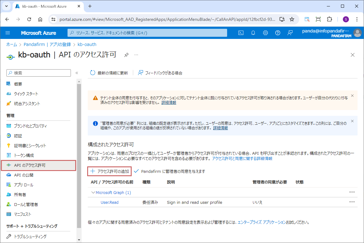 登録したアプリケーションの管理メニューから「APIのアクセス許可」を選択し、「アクセス許可の追加」をクリックします。