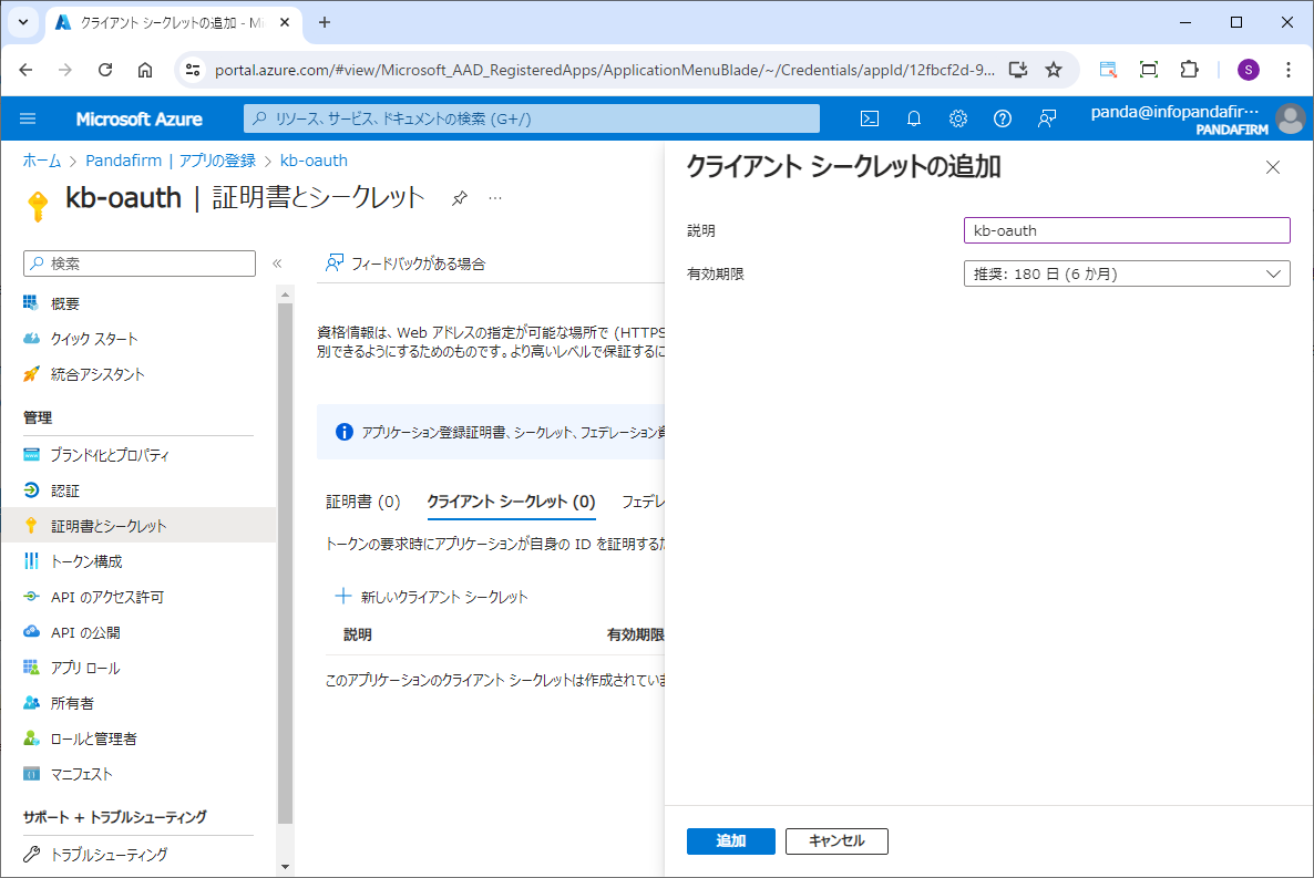 クライアントシークレットの説明を入力し、必要な有効期限を選択して「追加」ボタンをクリックします。