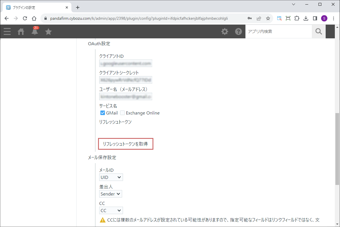 クライアントIDとクライアントシークレットを入力したら「リフレッシュトークンを取得」ボタンをクリックし、表示される認証画面でリフレッシュトークンを取得します。