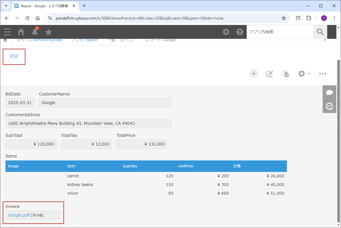 また、Boost! Mailと併用することで、レコード保存時にPDFを作成し、そのままメール送信をすることも出来ます。
