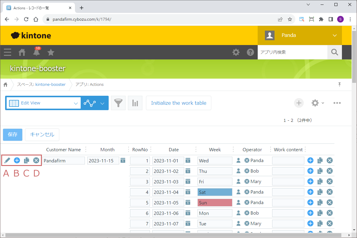 先頭列ではない列に表示されているボタンはテーブル操作に関するボタンになります。