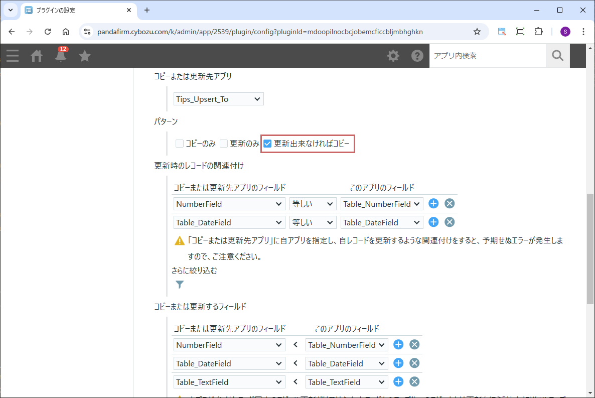 「コピーまたは更新するフィールド」指定欄の「このアプリのフィールド」にはテーブルに属しているフィールドを1つ以上指定します。