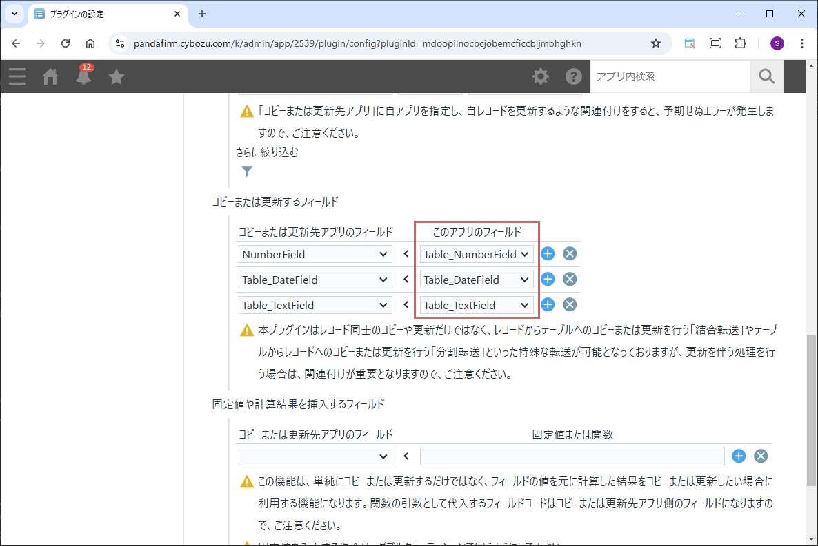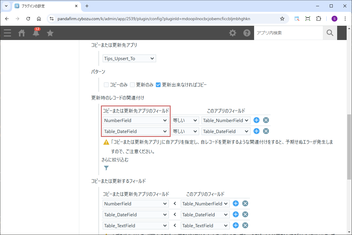 「更新時のレコードの関連付け」指定欄の「コピーまたは更新先アプリのフィールド」にはテーブルに属していないフィールドとテーブルに属しているフィールドの両方を指定します。