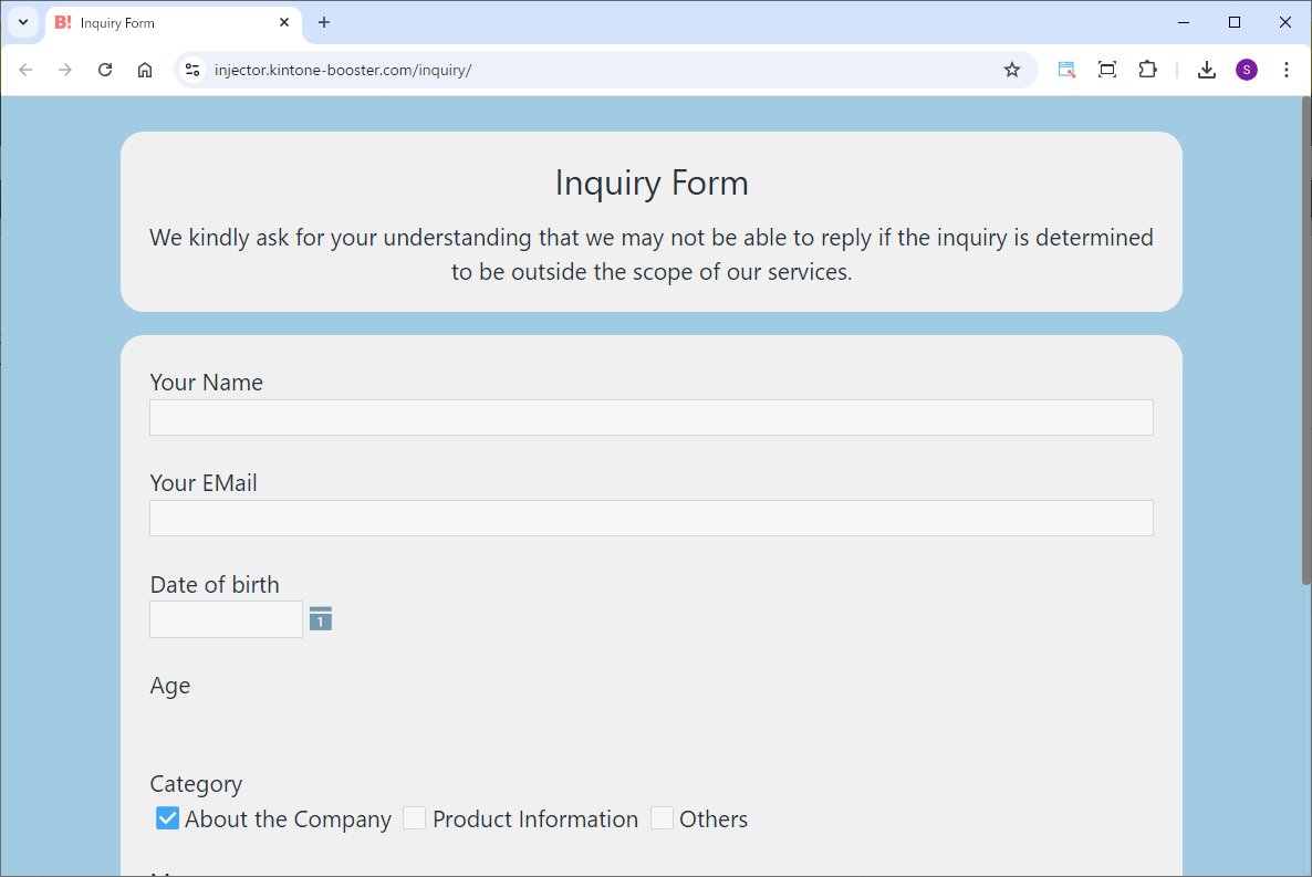 如果输入“injector”作为目录名称,则Web表单的URL将为“https://injector.kintone-booster.com/injector/”。 只能输入半角数字、小写英文字母 (a-z),以及连字符 (-) 和下划线 (_) 等符号。 |