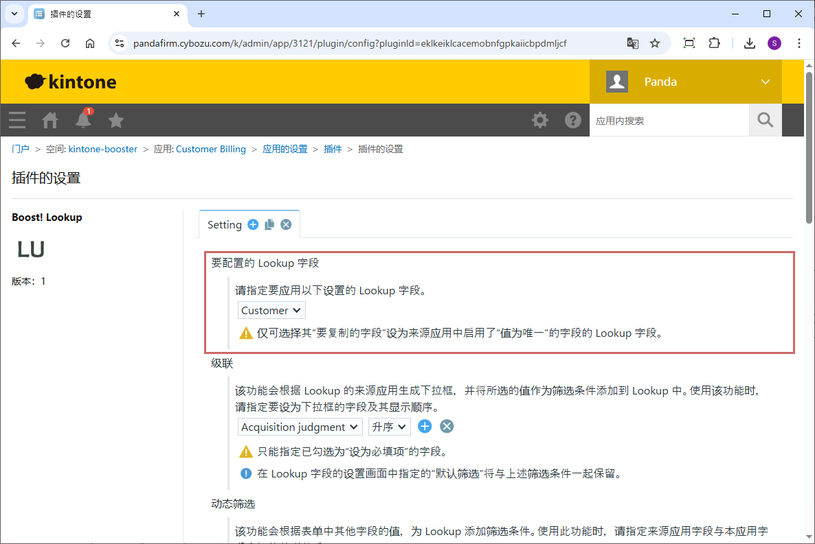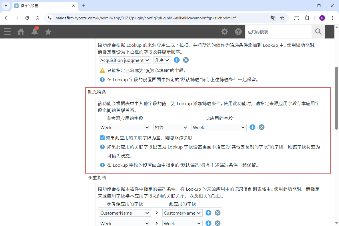 启用“动态筛选”设置后,指定字段的值会被追加为查找筛选条件。